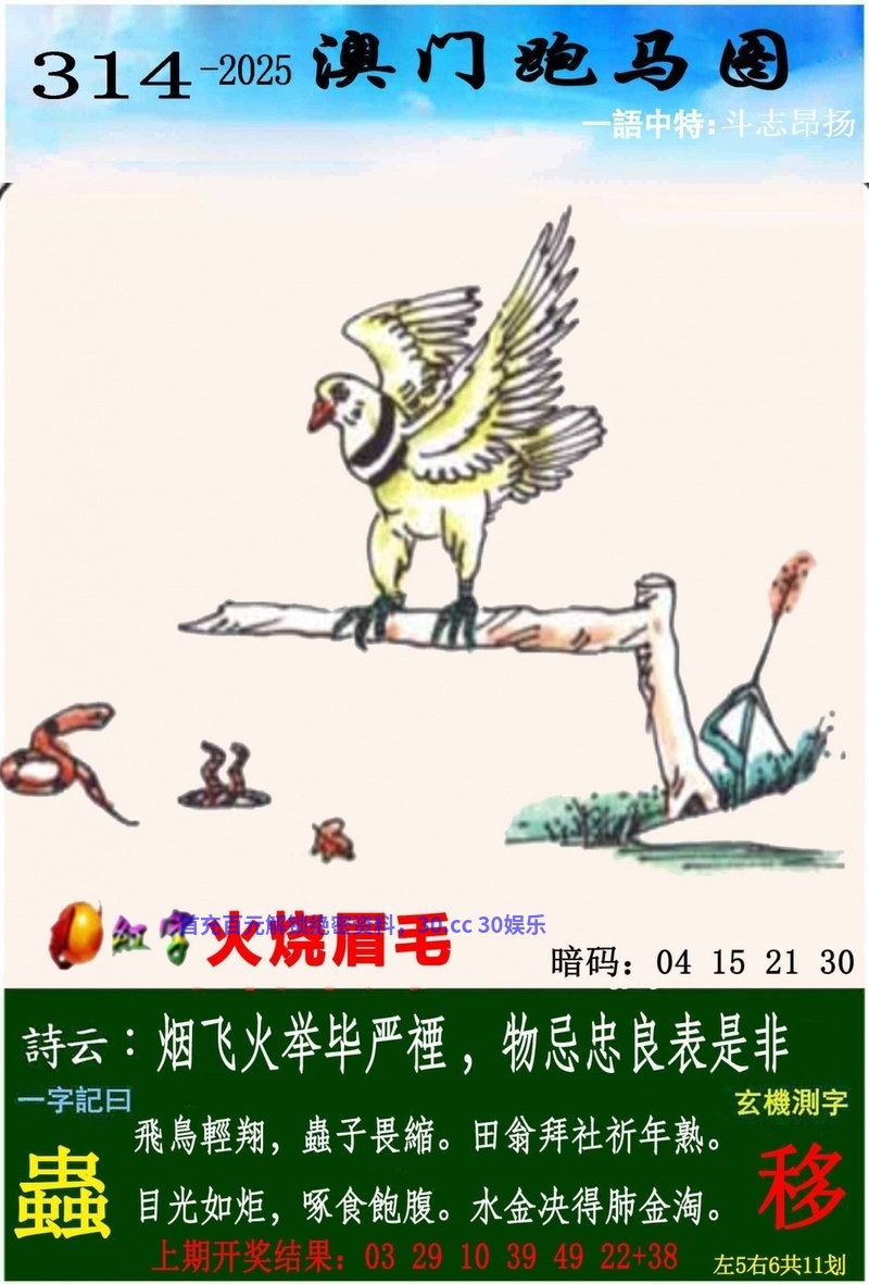 314期一字記曰:【蟲】 飛鳥輕翔,蟲子畏縮,田翁拜社祈年熟。目光如炬,啄食飽腹,水金决得肺金淘。 《移》 解:水金决得肺金淘,解水肖鼠猪,金肖鸡猴 生肖:鼠猪鸡猴狗羊 |