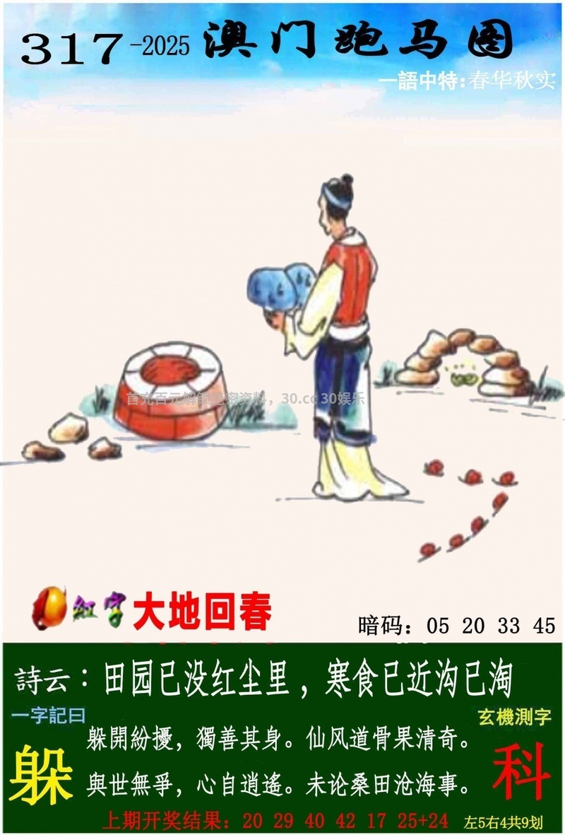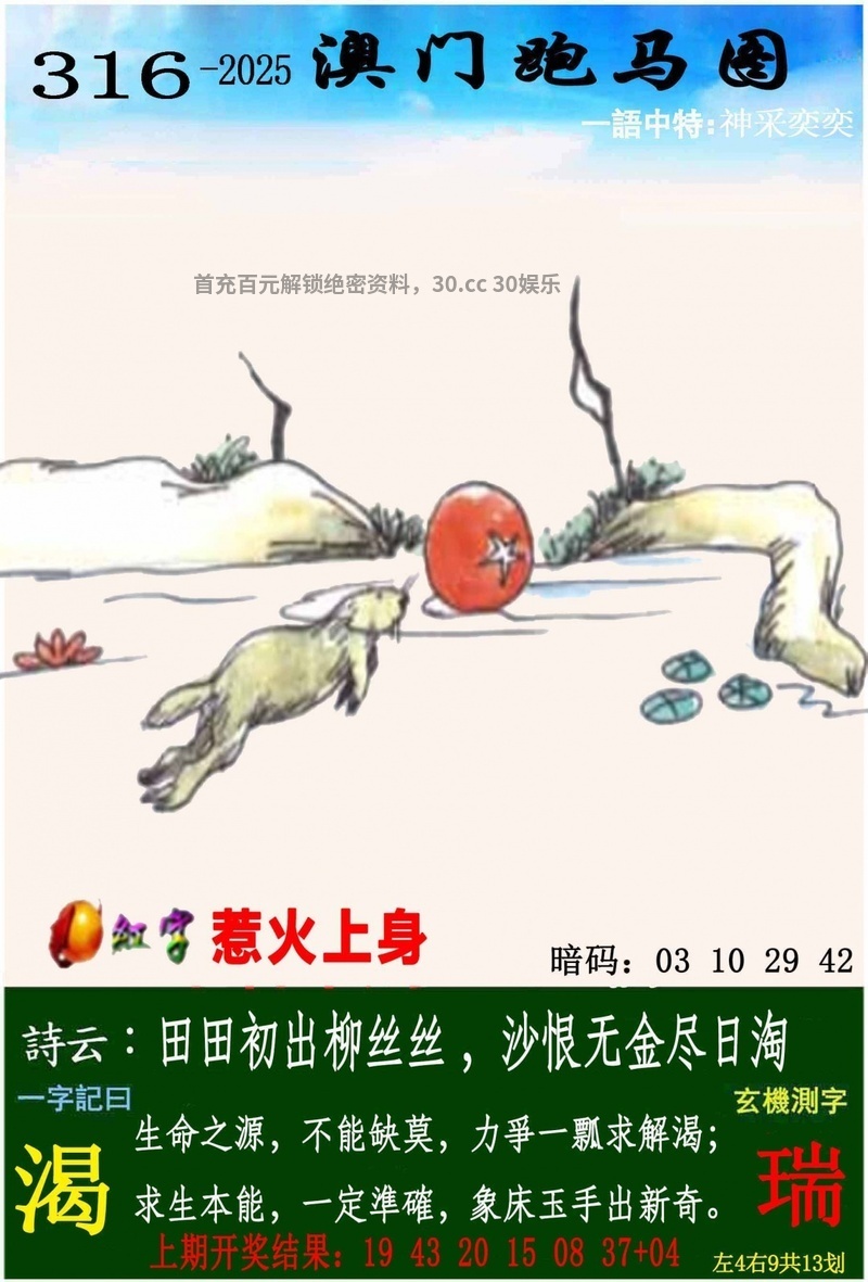 316期一字記曰:【渴】 生命之源,不能缺莫,力爭一瓢求解渴。求生本能,一定準確,象床玉手出新奇。 《瑞》 解:沙恨无金尽日淘,解金行的生肖鸡猴 生肖:鸡猴马狗虎牛 |