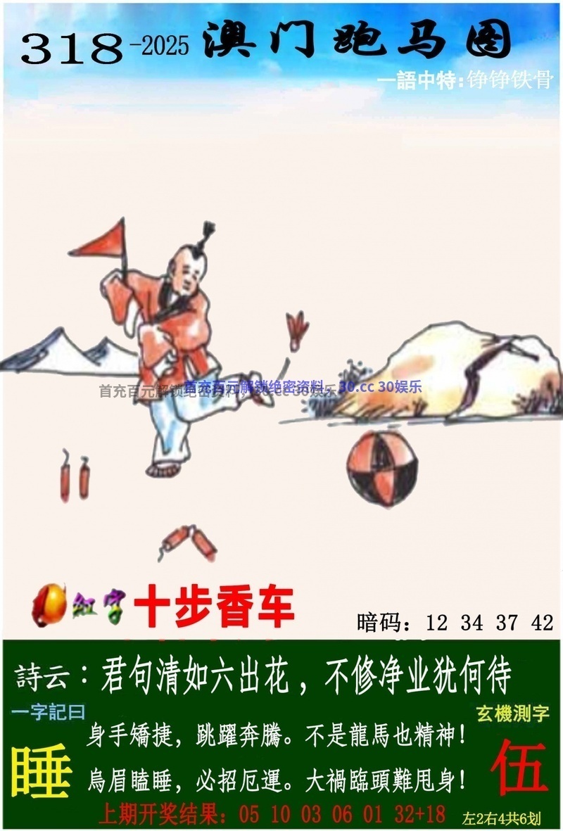 318期一字記曰:【睡】 身手矯捷,跳躍奔騰,不是龍馬也精神。烏眉瞌睡,必招厄運,大禍臨頭難甩身。 《伍》 解:君句清如六出花,解文官兔龙鸡羊猪鼠 生肖:兔龙鸡羊猪鼠 |